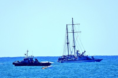 据以色列媒体10月2日援引军方消息报道,以军在1日晚至2日晨对“全球坚韧船队”的拦截行动中控制了41艘船,扣押400多人。图为2日,在以色列南部阿什杜德港附近,“全球坚韧船队”船只被拖向港口。 新华社发
